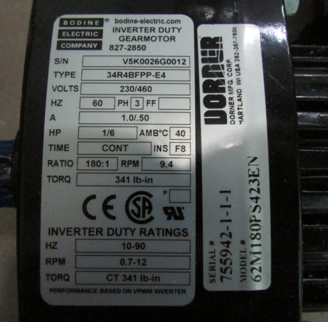 Dorner62MS423Motor0.25HP1725RPM208-230/460V~60Hz